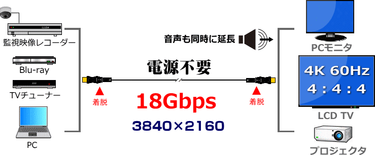 HDMIポートからの電源供給で動作しますので、外部電源なしで100mの延長が可能です。